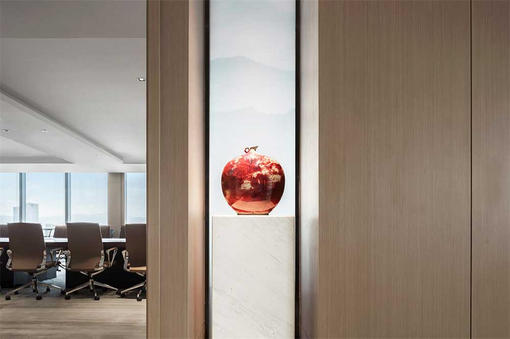 深圳市寶安1000平國中創(chuàng)投辦公室裝修會議室,中式月門的設(shè)計,兩邊做天然大理石瓷器展臺,更有古典文化底蘊。
