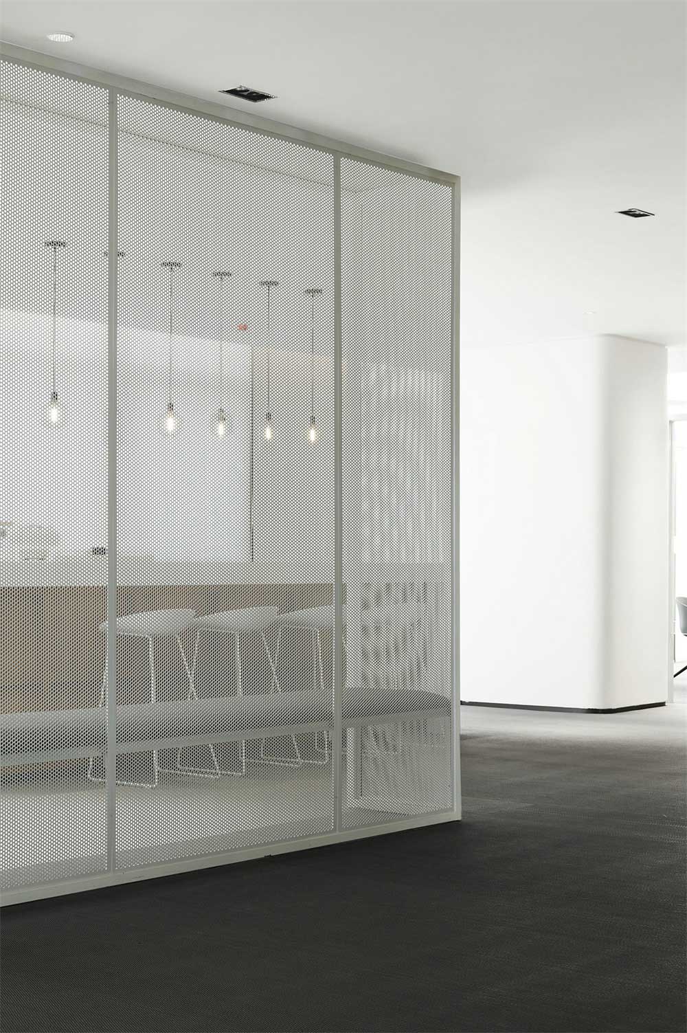 現代風格辦公室開放式會議室,設置在走道盡頭的開放式灰色,素雅時尚的白色會議桌椅,開闊的空間,更利于思考和交流。