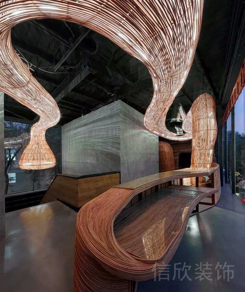 在墻體隔斷背后或旁邊設置一個弧形的木質休息區,選用舒適的座椅和柔軟的坐墊,以提供一個私密且舒適的休息空間。