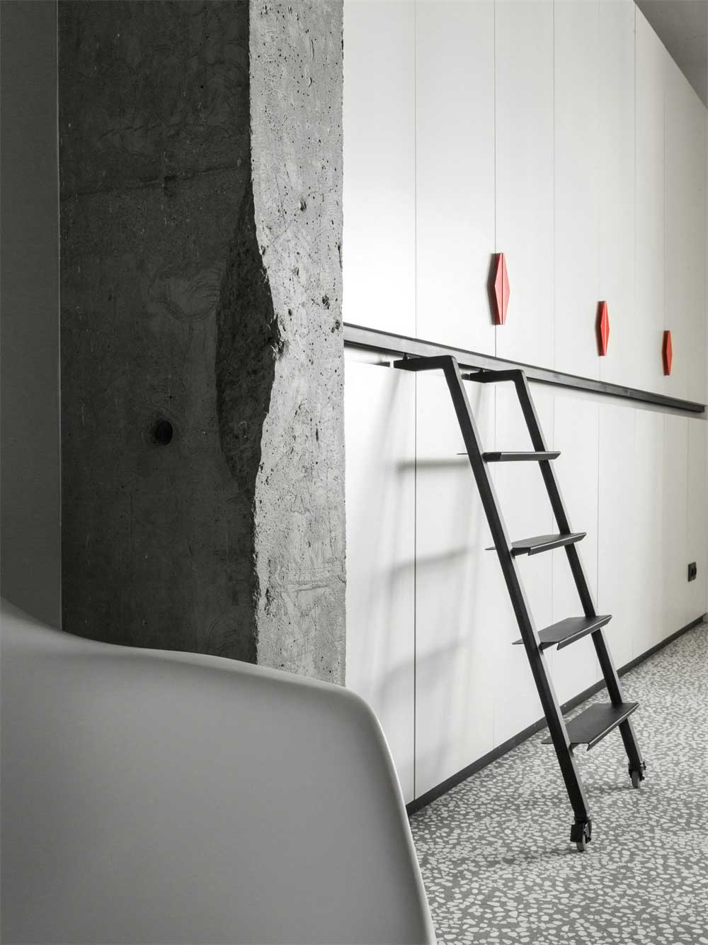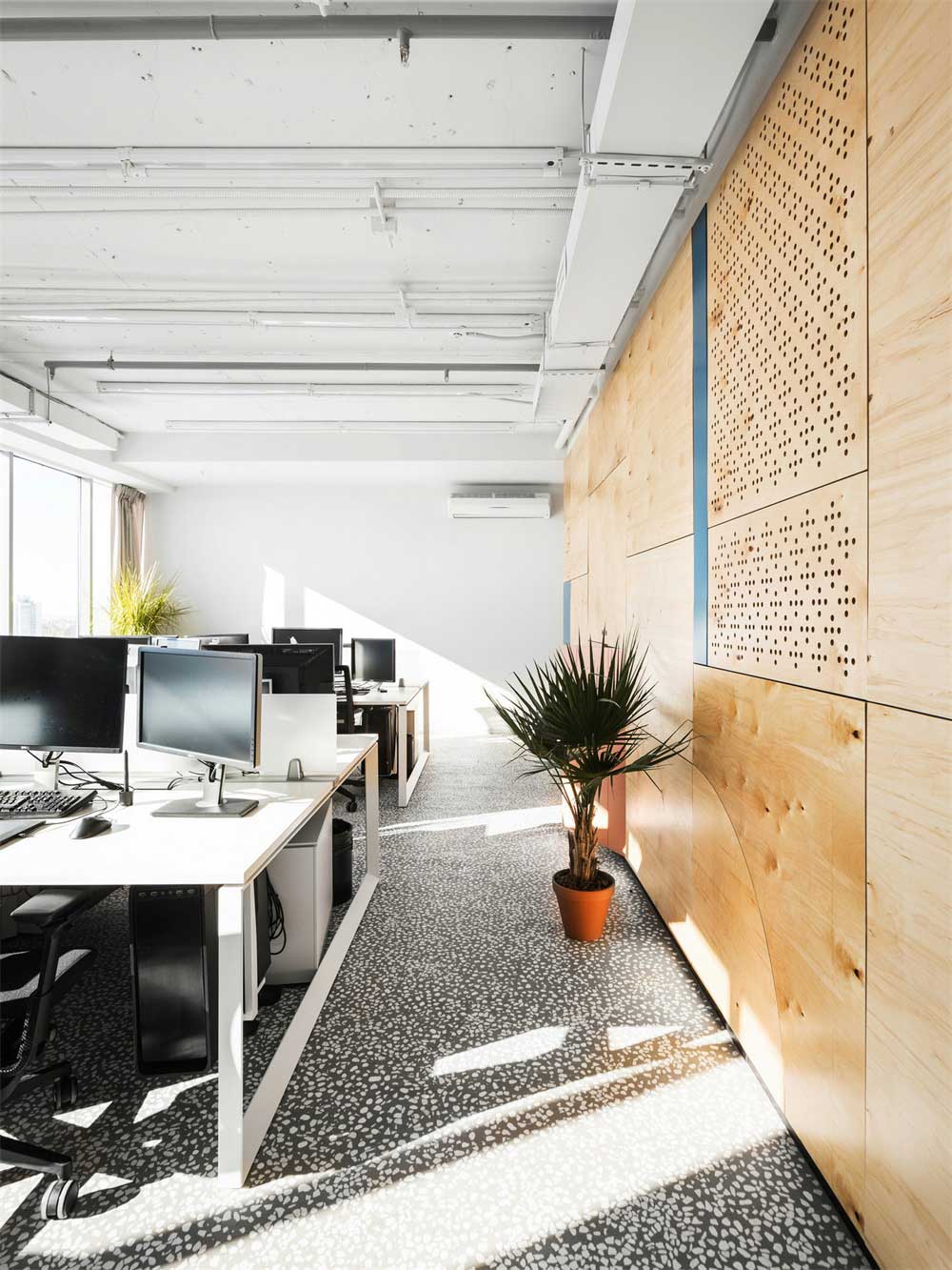 游戲公司辦公室走廊,刻意裸露的管道,和原木紋的墻面,凸出原始自然和工業感的特點。