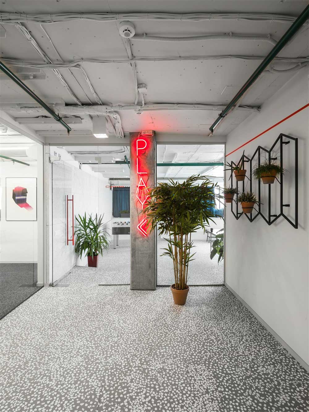 設計理念:本案是一所現代風格的游戲公司辦公室裝修設計案例,游戲公司的辦公室,因為其獨特的工作環境,需要創意和流行感兩者合一,符合年輕人的審美特點和喜好,同時充滿了酷炫和陽光的氣場,利于思維的發散,不會被環境緊固了想象,明快的節奏和工作的激情,如同我們在游戲里搏殺一樣,永遠的專注,永遠的年輕,不分年齡階段始終可以被那種緊張和刺激的氛圍所感染和帶動。入戶的位置,地面和頂面沿用了以前的原始結構,星點的水泥地面,有種復古的感覺,白色的原始頂面和裸露在外的線管和燈線,充滿了工業風的冷峻感。不同形狀的霓虹彩燈,則是街頭文化的特點,狂野而前衛,原木風混合不同顏色的小隔間設計,不規則分隔的地毯,黑色通明玻璃的會議室,讓一切始終走在時代的前沿,但又區分于流行的元素,對生活,對時尚有著自己獨特的思維方式,和認知的理念。