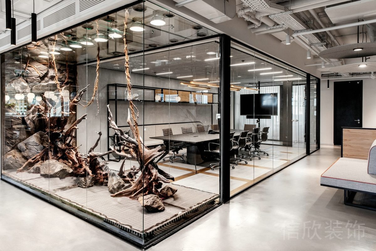 游戲公司辦公室會議室,黑色透明玻璃圍成的小區域,起到了私密性的效果,但不影響光線的引入。