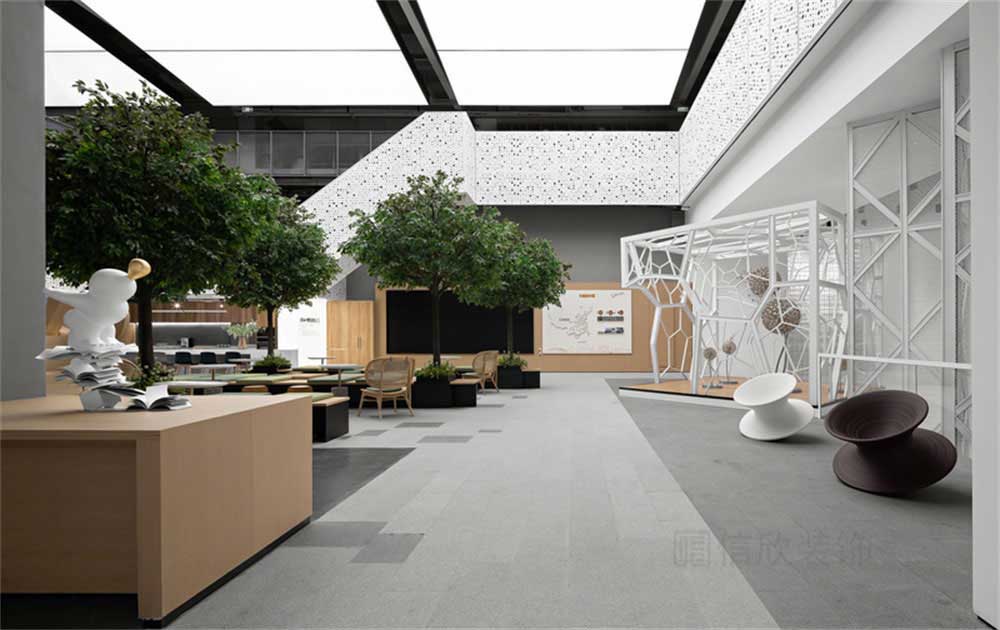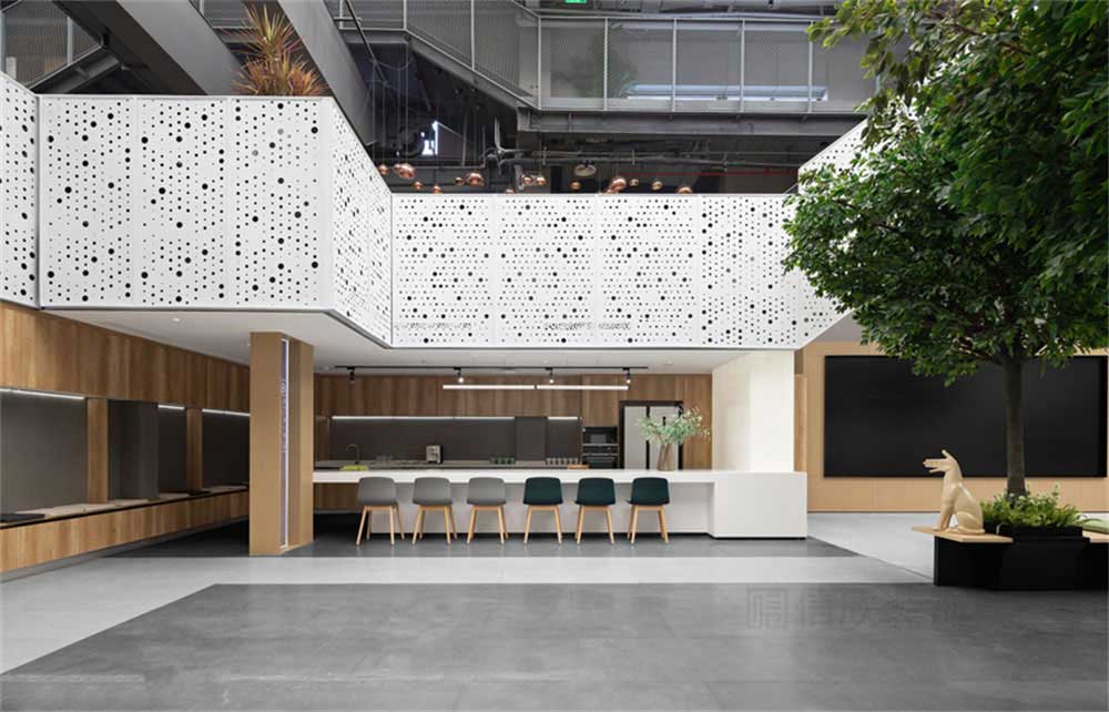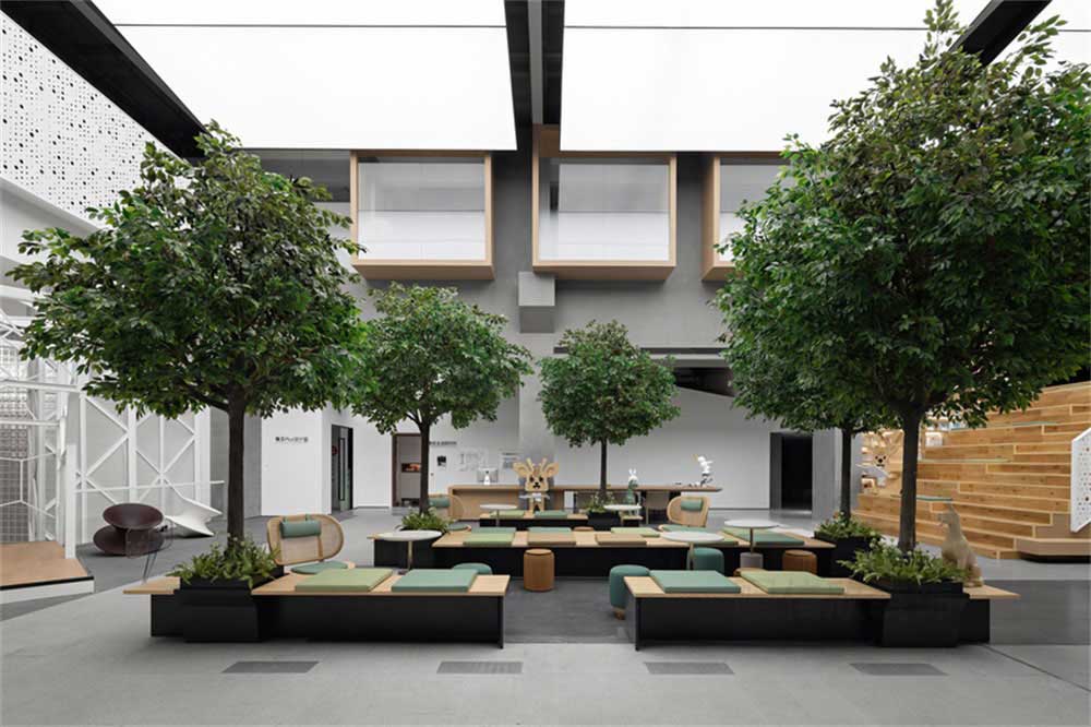 會客區域,整體打造出“陽光公園”的概念。綠色植物和長條的木制座椅,和草木綠的軟墊做出亂中有序的構成感覺,給人有置身公園、享受戶外的空間感。