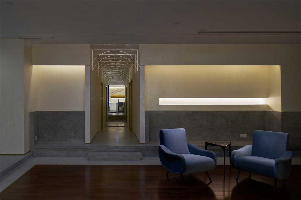 過道的裝修設計,灰色水泥墻凸顯肌理,透明的亞克力玻璃制造出的拱形門質感,如水晶般發散著光輝。
