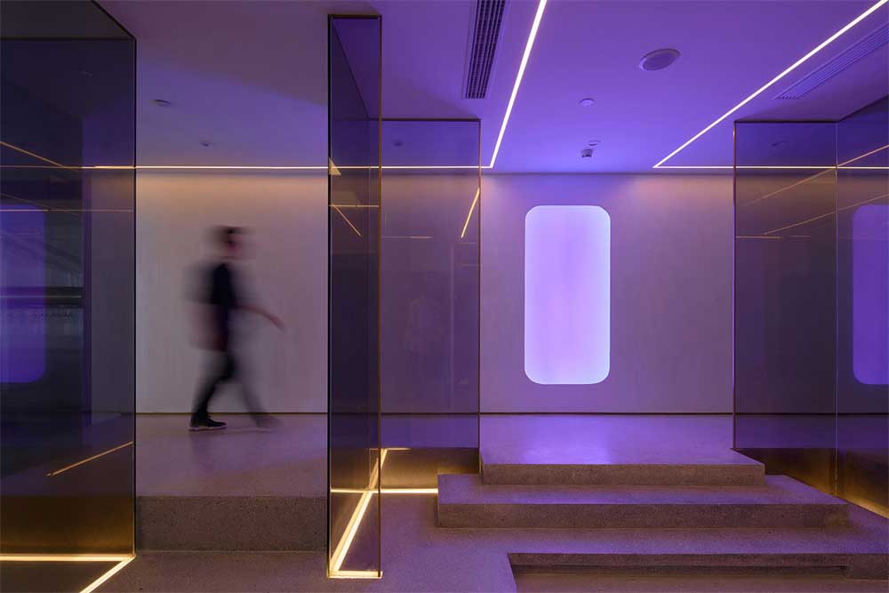 辦公室入戶,黑色半透明的玻璃,無規律的排列,在底部光影折射下,神秘而低調。