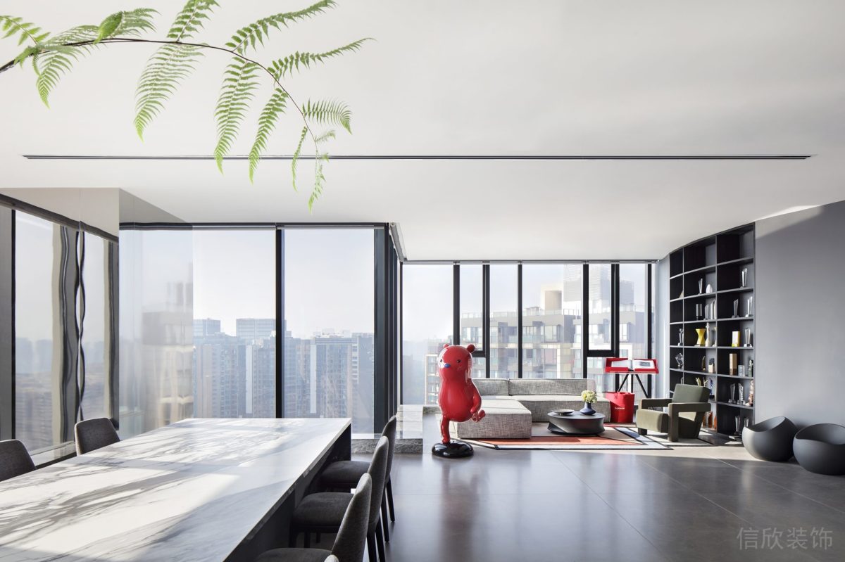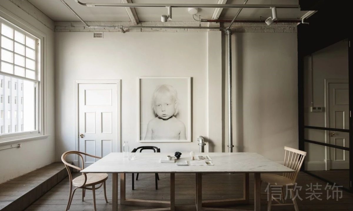白灰撞色的極簡風桌椅與內嵌式燈條天花板的組合,能夠創造出一種現代、整潔而不失個性的室內空間。