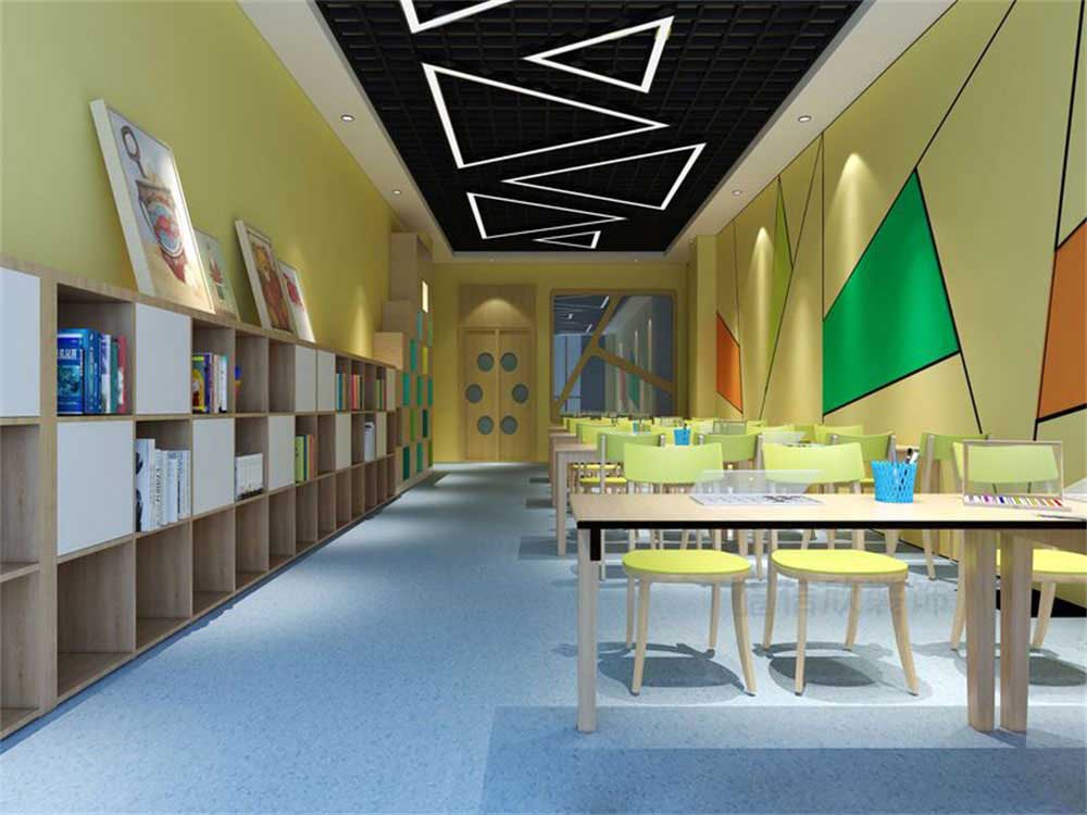 課室的設(shè)計(jì)上沿用幾何式的分割理念,黑色格柵頂上,用三角形的燈膜,讓頂面更具有設(shè)計(jì)感,黃色為主題,橙色和綠色的錯落有致墻面,則有一種如七巧板一樣的童趣和創(chuàng)新意識。