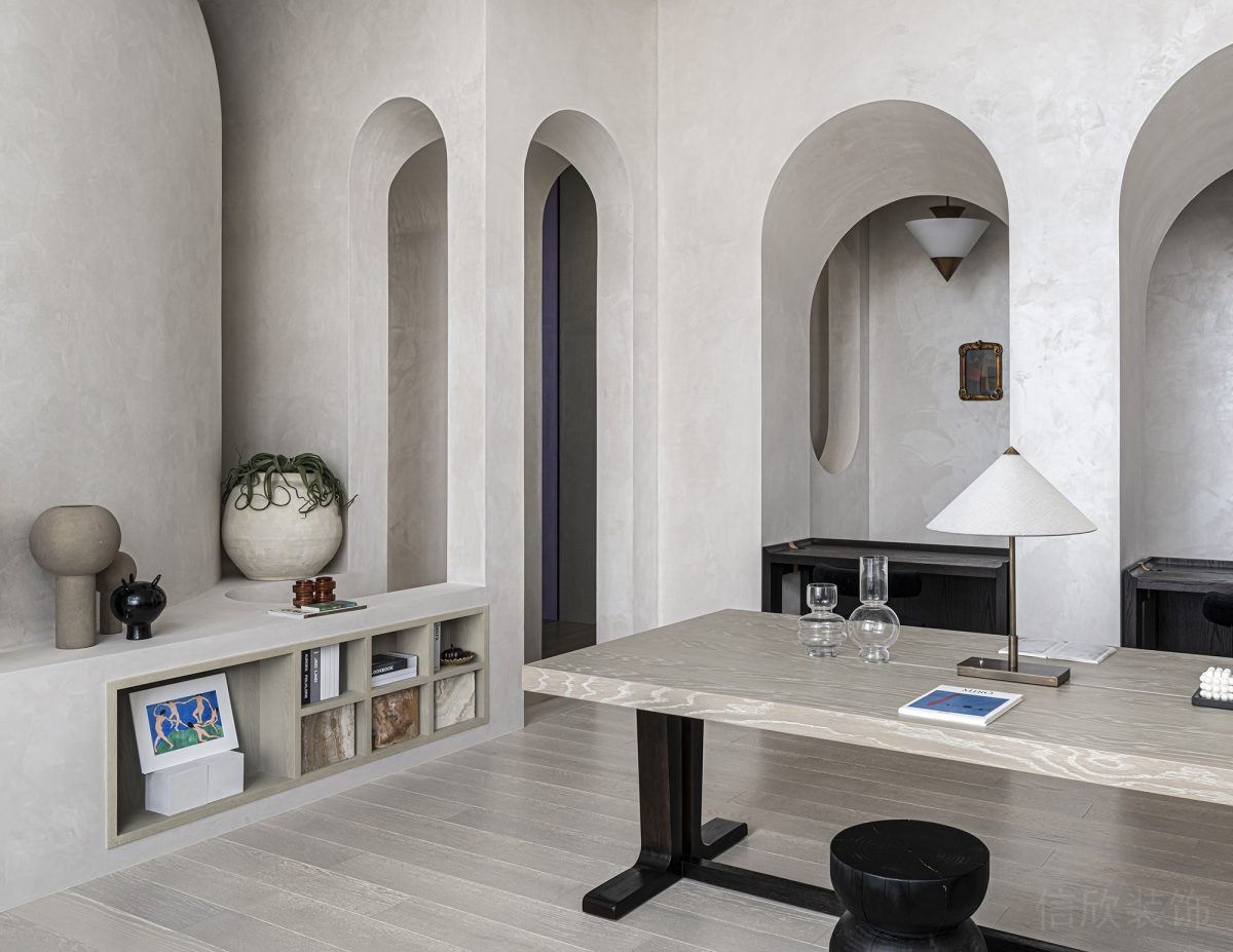 結合木飾面材質的內嵌儲物柜設計,不僅節省了空間,還增加了實用性。
