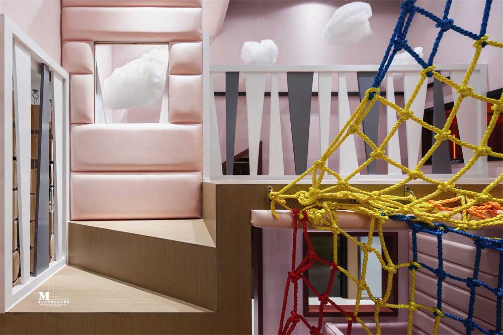 地面用蜂窩狀的地磚拼貼,趣味空間從地面延伸到頂。