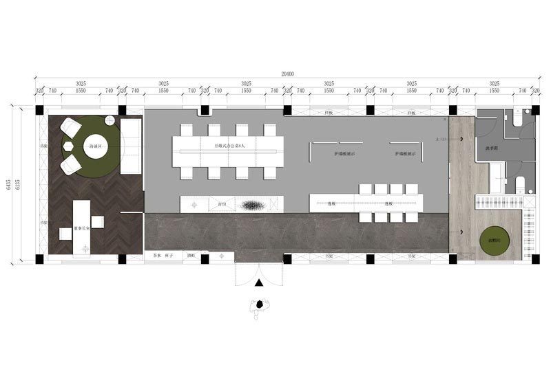 開敞的接待、展示區與私密的洽談區。 天花大體快的切割,增強空間延續性。