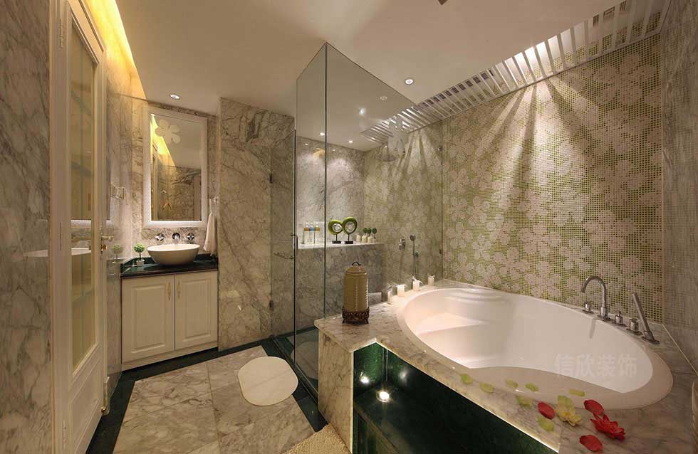 天然石材墻地一體的大理石運(yùn)用,紋理豐富,特點(diǎn)鮮明,歐式風(fēng)格的洗手柜,綠色的天然大理石設(shè)計(jì),高端和自然的結(jié)合,簡(jiǎn)約中透出貴族般的格調(diào)和檔次。