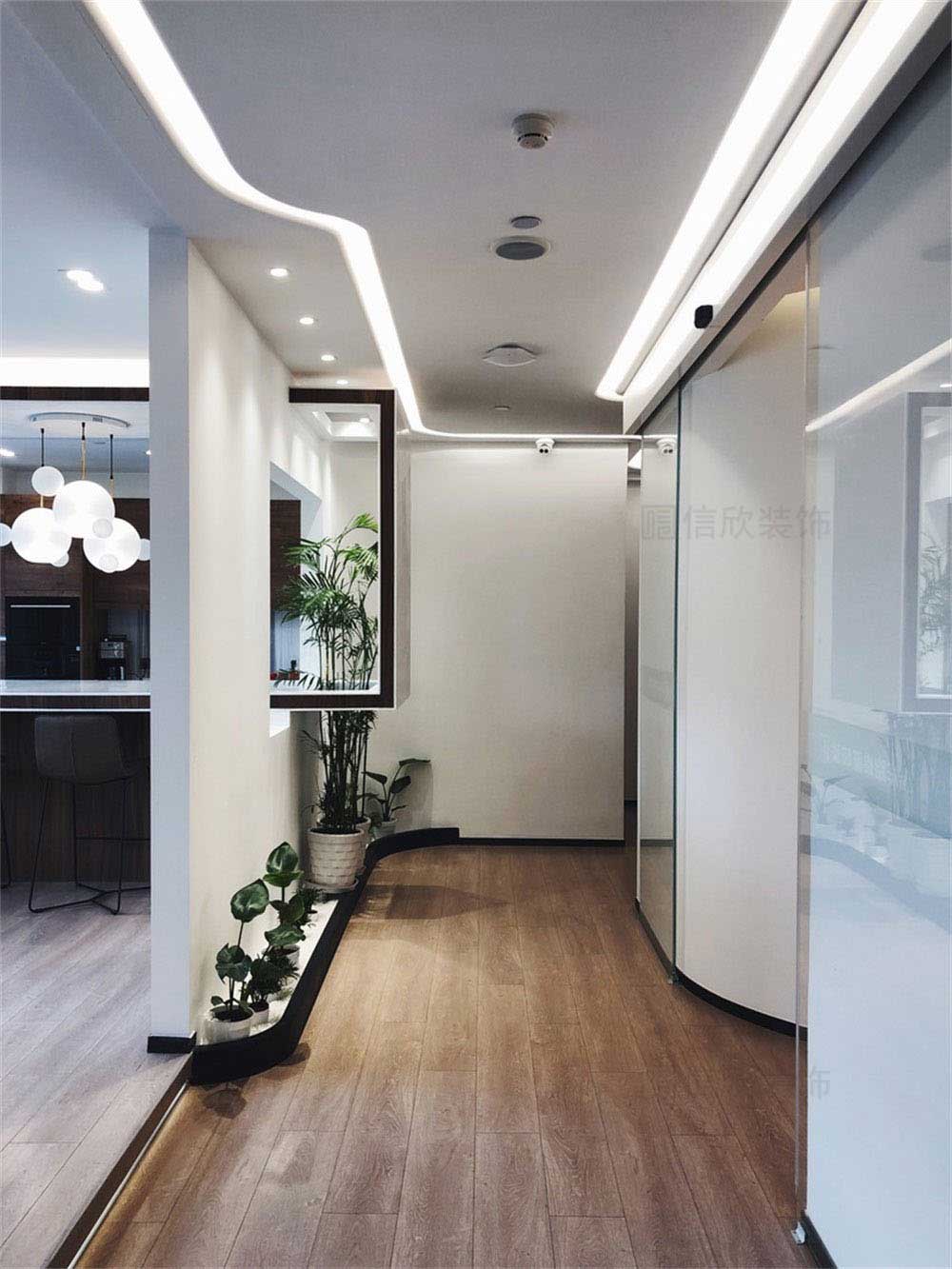 走廊的裝修設(shè)計(jì),開闊式的設(shè)計(jì),一眼望去可以直接看向盡頭,原木風(fēng)的地面,搭配直通到底的燈膜設(shè)計(jì),曲線靈動(dòng),明亮大方。