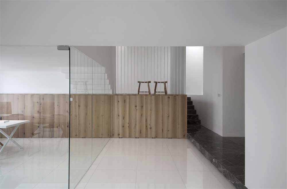 原木系的護(hù)墻板包邊,黑色大理石的樓梯的過道,設(shè)計新穎,理念前衛(wèi)。