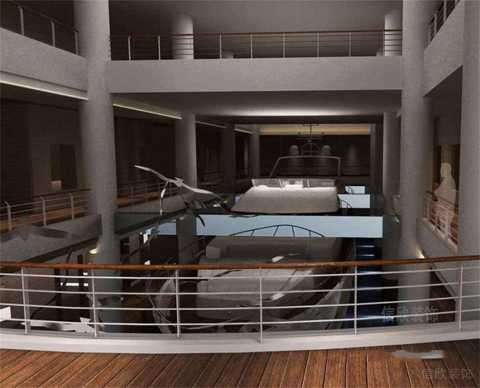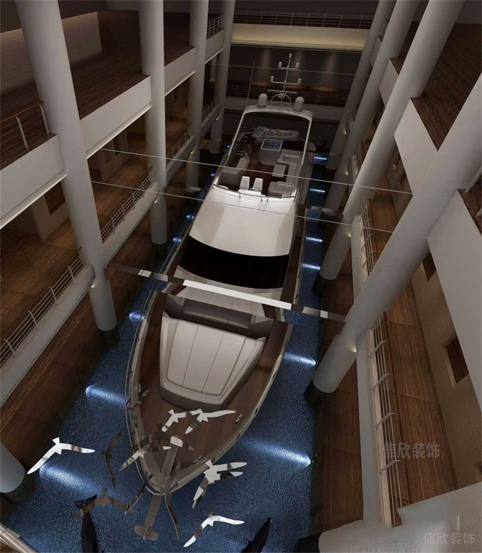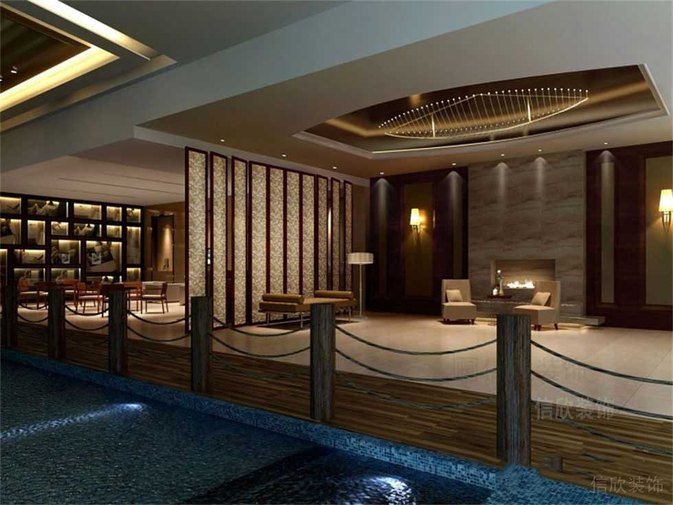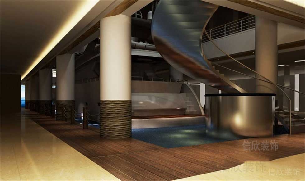 前臺的裝修設計,采用地磚和游艇區的原木地板做了區分,同時用原木風格的頂面和原木內置射燈的花架景觀,實木弧形白色的前臺,讓一切看起來既自然而不失華美富貴的味道。