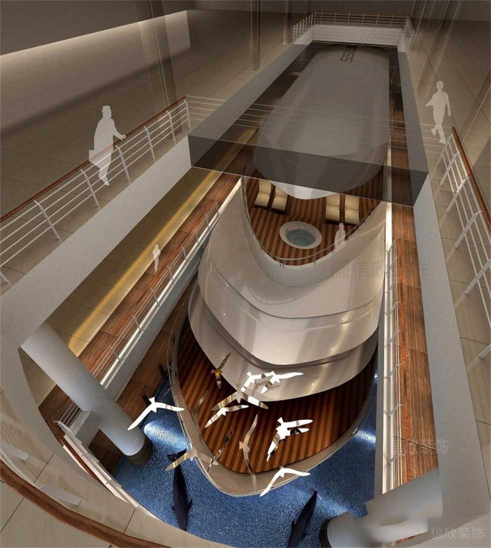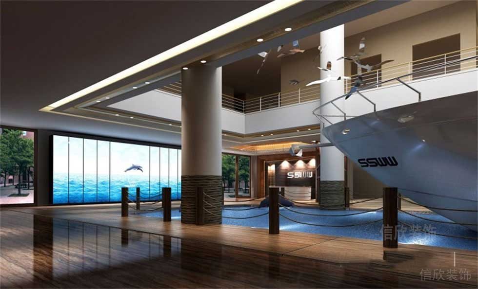 公共空間的裝修設計,采用度假酒店的設計理念,一樓大廳直接留出一片空間作為海景,然后引入豪華游艇的設計,從世界前沿的設計出發,打造出極具特色的輕奢感十足的大廳景觀。