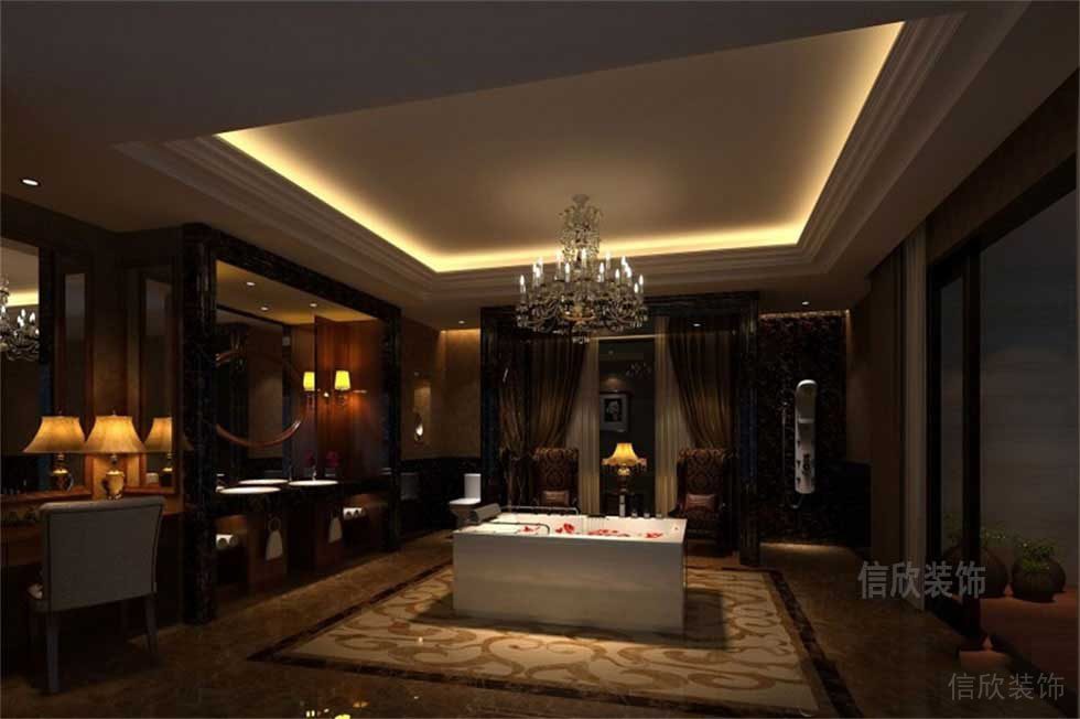 通過瓷磚不同種類的顏色對比,階梯式的浴缸,以及功能齊全的落地式浴室鏡,淋浴器,超大型洗手臺等功能的分布,寬敞的空間,層次十足的地面拼花,帶來古典式的貴族生活。