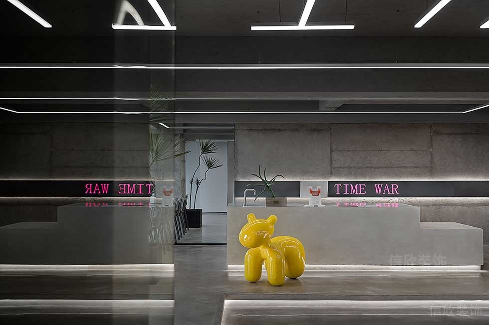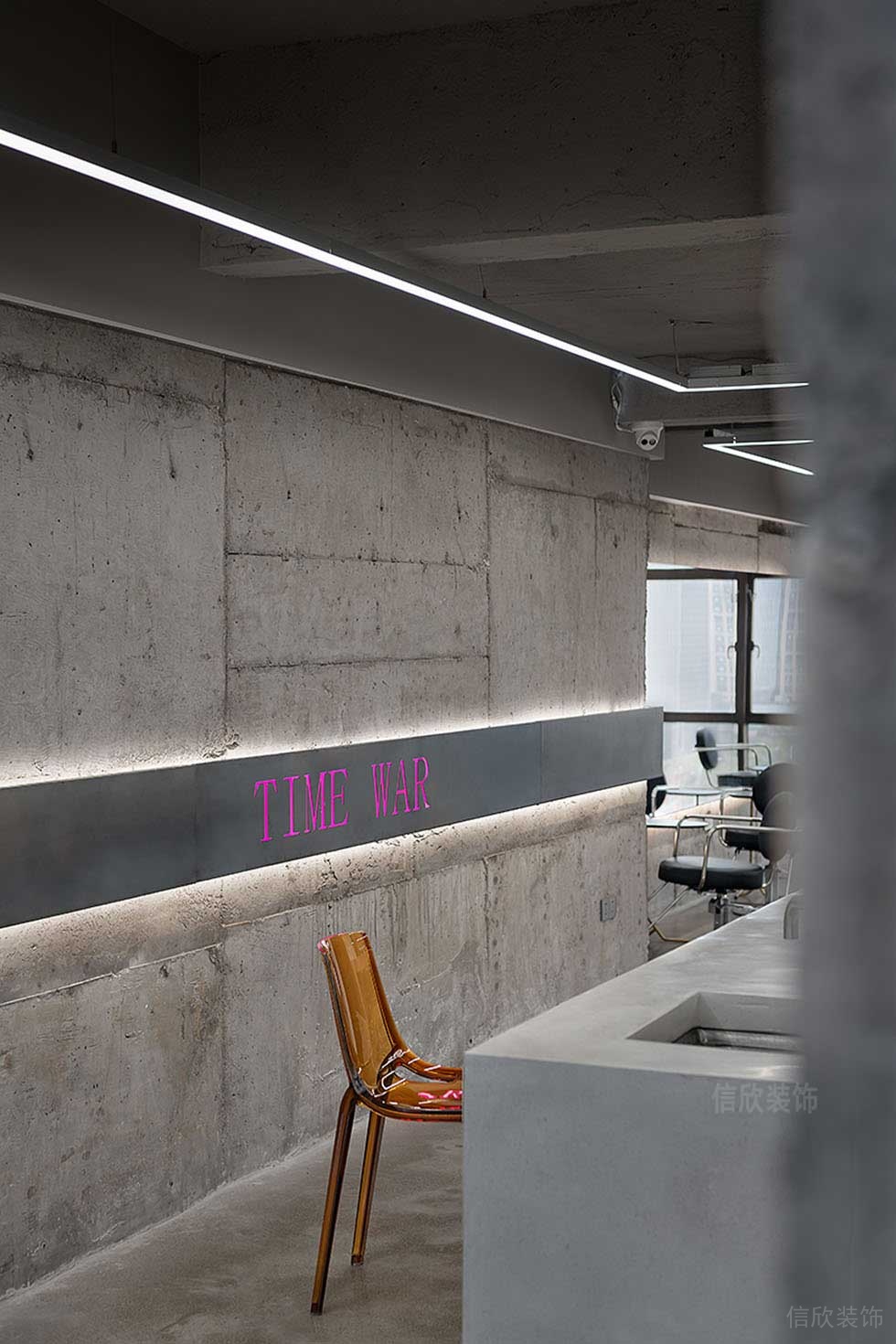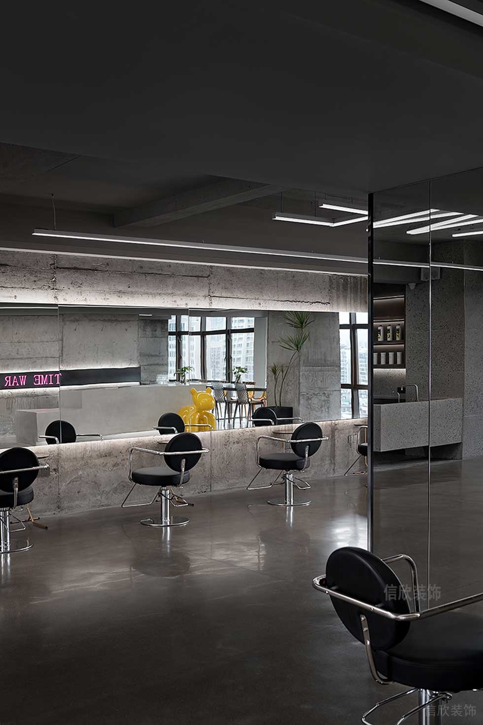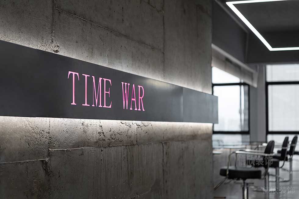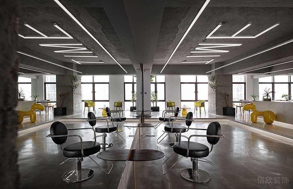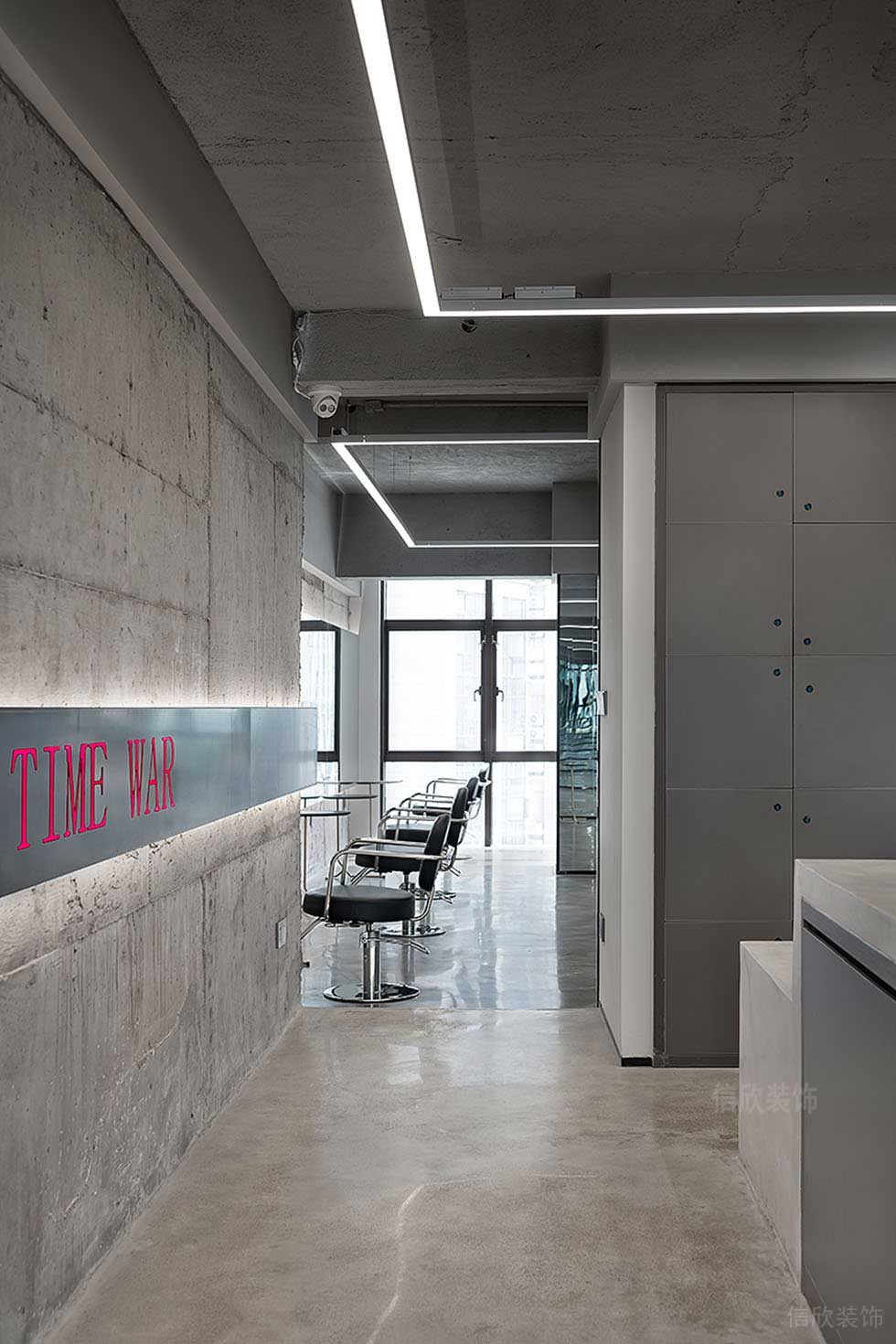 吧臺的背后清水泥灰色墻面上是嵌入燈帶的logo,是視覺中心,時尚潮流、視覺沖擊。理發(fā)區(qū)是一個全開放的區(qū)域,整齊劃一的座位排布,形成規(guī)整的序列,設(shè)計師則要重點傳達(dá)專業(yè)的姿態(tài)。